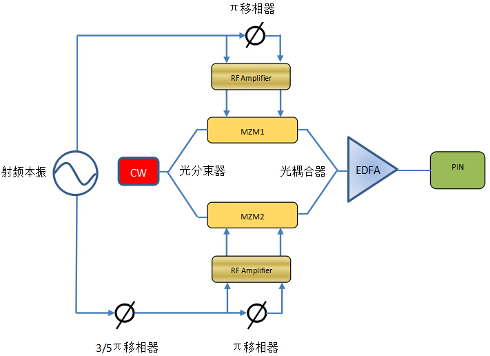 基于光学外调制器-相位调制器和MZM铌酸锂调制器的非线性调制器的方法可以产生高频、高频谱纯度微波信号。利用很低频率的射频本振,就可以由两个具有良好相干性的高阶的同阶上下边带拍频后产生高频微波信号。如下图利用两个MZM级联可产生高倍频微波信号,无需光滤波和色散补偿。
